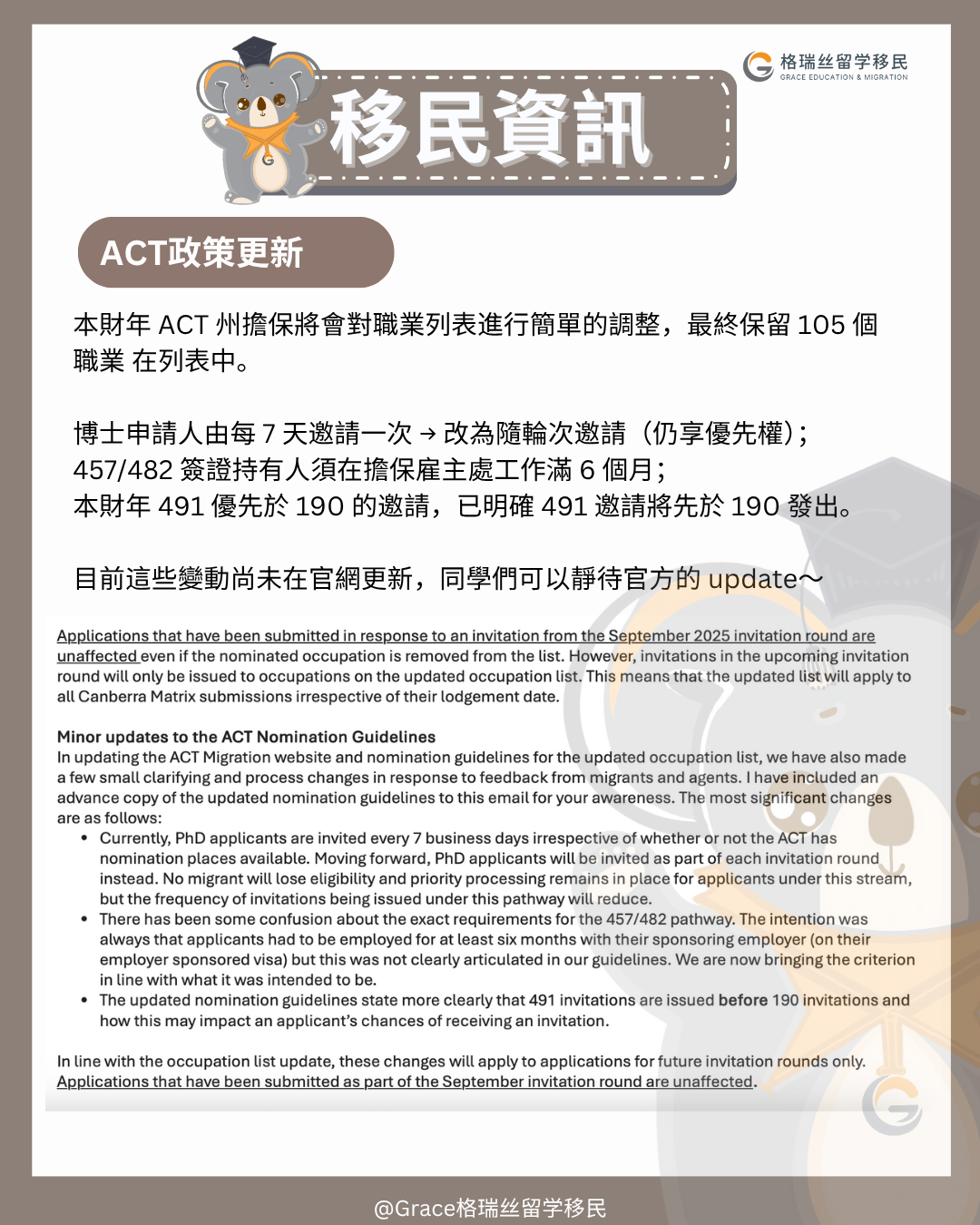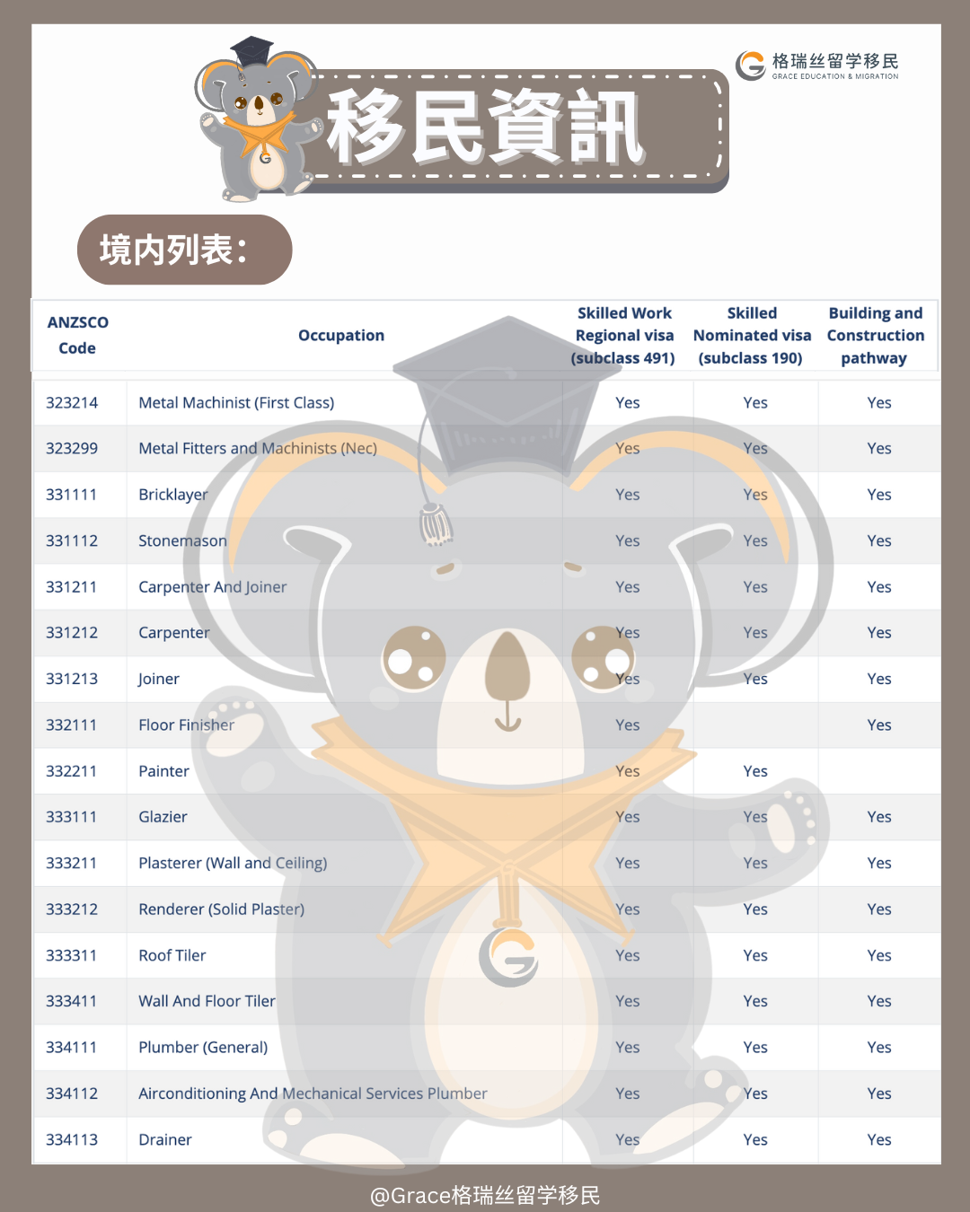 同學們注意!昆州州擔保境內職業列表重磅更新啦🎉! 這次清單直接涵蓋多個熱門移民領域 —— 建築類(像建築專案經理、工料測量師)、工程類(土木、電氣工程師)、教育類(中小學教師)、護理類(註冊護士)全數在列,都是昆州目前急缺的刚需職業! 具體職業列表詳見下方: 不同職業的申請門檻略有差異,比如部分需符合昆州本地工作時長、英語成績等要求,建議大家抓緊時間對照清單,確認自己的職業是否在榜,盡早準備 ROI 材料! 想沖昆州 190/491 的朋友千萬別錯過這波資訊,有疑問也可以隨時滴滴~