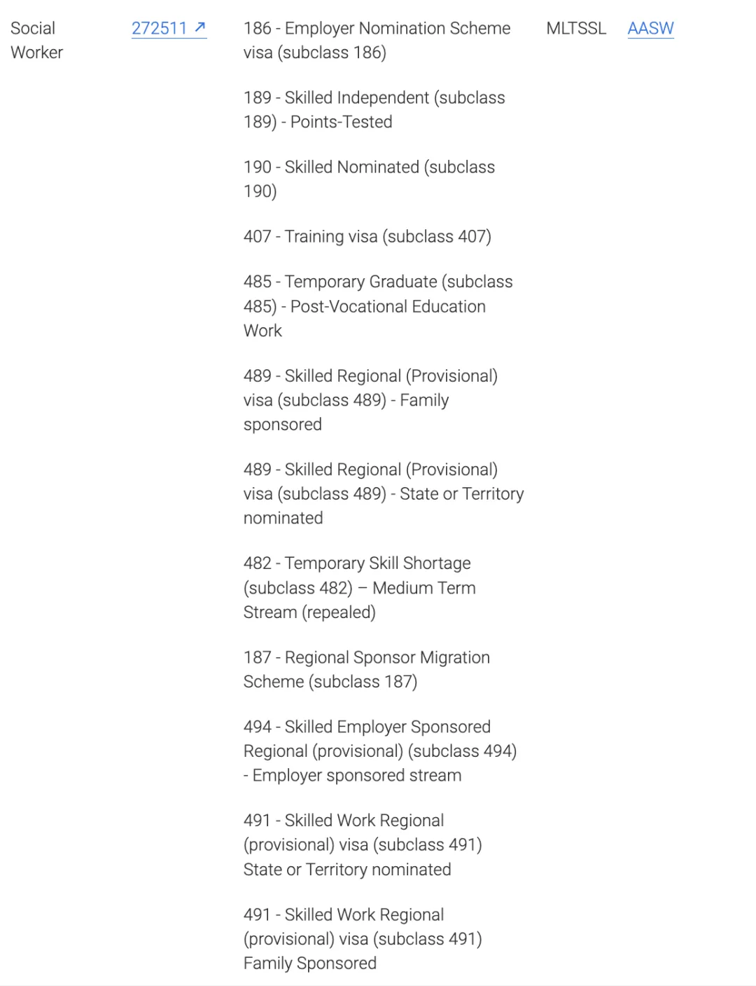從移民的角度來看,社工(Social Worker)職業位列澳洲MLTSSL中長期緊缺職業清單。不僅可以申請189獨立技術移民,190/491州擔保,也有機會申請雇主擔保類簽證移民。