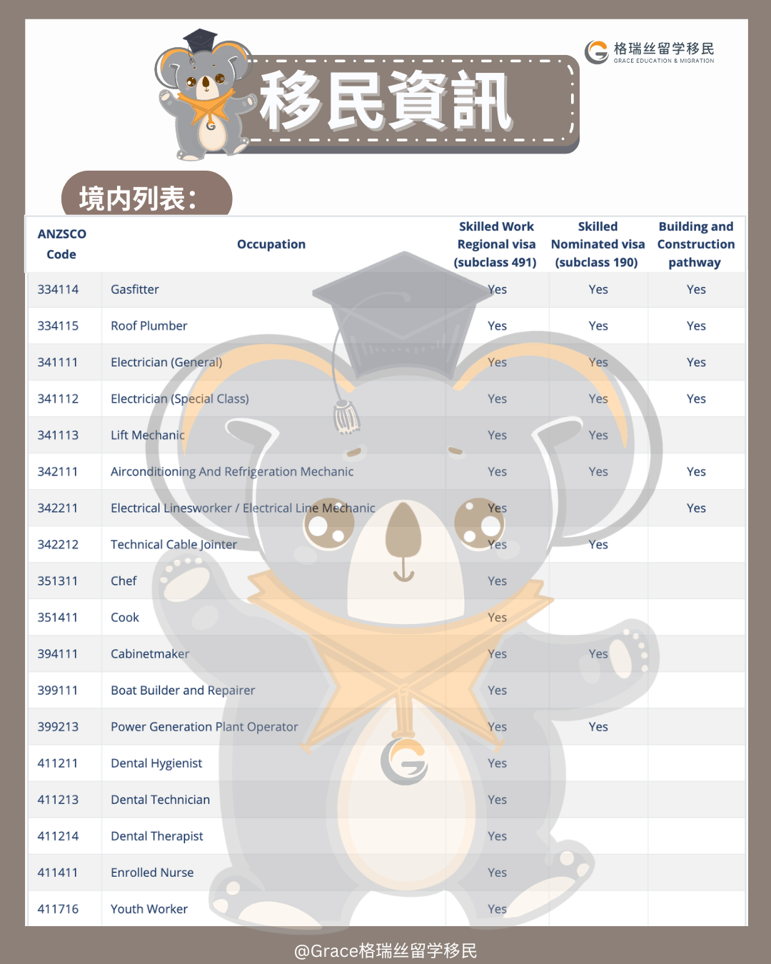 同學們注意!昆州州擔保境內職業列表重磅更新啦🎉! 這次清單直接涵蓋多個熱門移民領域 —— 建築類(像建築專案經理、工料測量師)、工程類(土木、電氣工程師)、教育類(中小學教師)、護理類(註冊護士)全數在列,都是昆州目前急缺的刚需職業! 具體職業列表詳見下方: 不同職業的申請門檻略有差異,比如部分需符合昆州本地工作時長、英語成績等要求,建議大家抓緊時間對照清單,確認自己的職業是否在榜,盡早準備 ROI 材料! 想沖昆州 190/491 的朋友千萬別錯過這波資訊,有疑問也可以隨時滴滴~